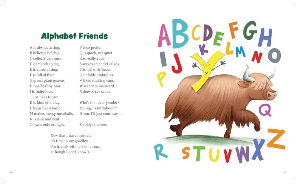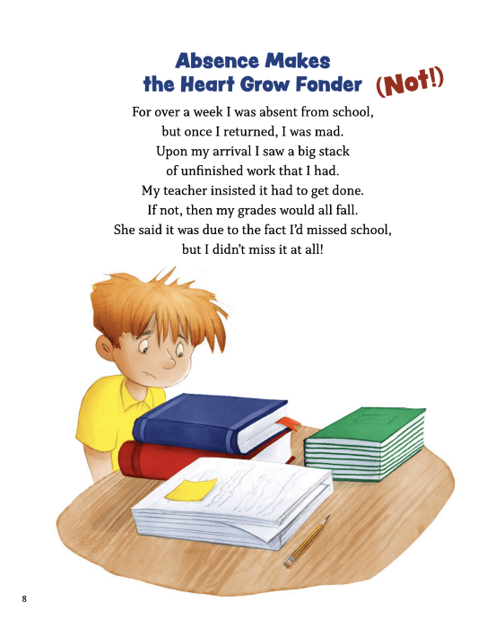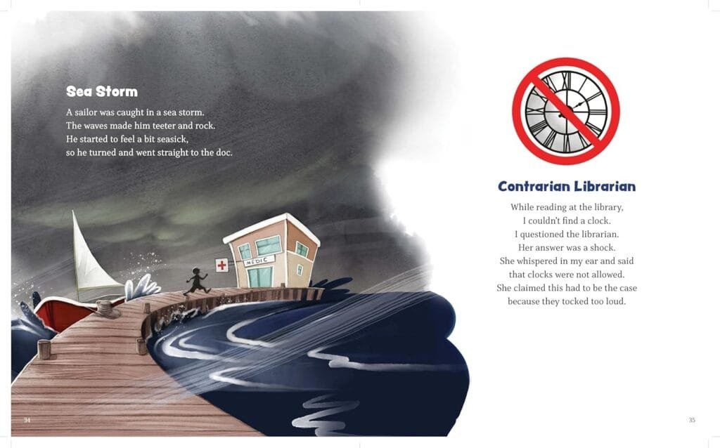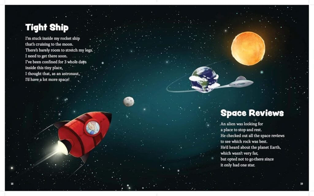 Packed with witty humor, this clever mix of poetry and puns features everything from animals and beloved nursery rhyme characters to outer space and favorite sports. Each poem contains at least one word or phrase with a double meaning, which will not only make children (and adults!) laugh out loud, but also provides a fun lesson on homonyms. The short poems, the lovely art, and the groan-worthy punchlines will leave readers begging for “just one more.”